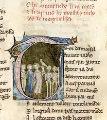 Les trois mors et les trois vis[12] is a variation of the legend of the Three Dead and the Three Living in 216 lines.[11] It "is a showcase of poetic virtuosity".[1] It is known from three manuscripts, two complete copies in Paris and a fragment in the manuscript Chantilly 1942.[11][13]