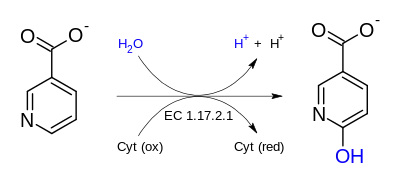 Nicotinate dehydrogenase (cytochrome) (EC 1.17.2.1, nicotinic acid hydroxylase, nicotinate hydroxylase) is an enzyme with systematic name nicotinate:cytochrome 6-oxidoreductase (hydroxylating).[1][2] This enzyme catalyses the following chemical reaction
