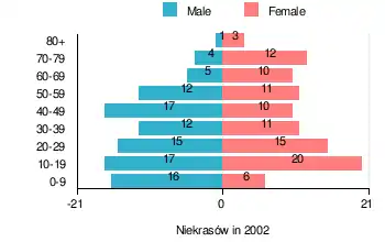 According to the 2002 Poland census, there were 197 people residing in Niekrasów village, of whom 50.3% were male and 49.7% were female. In the village, the population was spread out, with 25.9% under the age of 18, 37.6% from 18 to 44, 20.3% from 45 to 64, and 16.2% who were 65 years of age or older.[2]