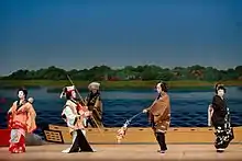 In henge mono, the same actor transforms into different characters with a rapid change of costume, and plays between three and twelve (usually seven) characters, one after another – male and female of all ages, from different periods and of all social strata, animals, apparition, and gods.[35] Henge mono was very popular at the start of the 19th century, particularly with the two great actors Bandō Mitsugorō III and Nakamura Utaemon III, who competed to develop this genre.[36] Today, the genre of henge mono is broken down into several plays, one for each character, which are performed independently, like the famous play Fuji-musume, which was originally the first part of a series of five quick-changes: the girl changes into a blind person (zatō), a celestial deity (tenjin), a servant of the samurai (yakko) and a boatman. Nowadays, many quick-change plays no longer exist in their entirety, with one exception: Rokkasen (six great poets), a play of one performer transforming into 5 poets, for which all 5 quick-changes are still extant and known of.
