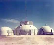 MAR-I at White Sands, seen looking towards the south-southwest. The transmitter is on the small dome on the right, with its associated receiver on the main dome above it. The elements fill only a small area of the original antenna outlines.