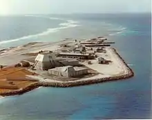 Construction of the launch site on Meck began in late 1967. In this installation, the majority of the system was built above ground in a single-floor rectangular building. The MSR was built in a boxy extension on the northwestern corner of the roof, with two sides angled back to form a half-pyramid shape where the antennas were mounted. Small clutter fences were built to the north and northwest, and the western side faced out over the water which was only a few tens of meters from the building.[108] Illeginni did not have a radar site; it was operated remotely from Meck.[109]