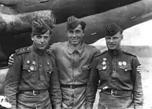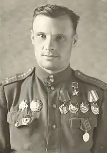 He distinguished himself during the Battle of Berlin in 1945, when he twice led a group of Il-2s to destroy enemy artillery and mortar positions on the southwestern outskirts of Berlin on 24 April. With a well-aimed air strike, the group managed to successfully destroy four artillery batteries.[1][5]