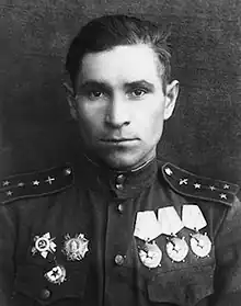 3. Yevstigneev, Vladimir; Sinitsyn, Andrey (1965). Люди бессмертного подвига: очерки о дважды Героях Советского Союза (in Russian). Moscow: Politizdat. p. 274. OCLC 951801699.