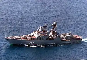 During his long naval career Vinogradov was awarded two Orders of Lenin, five Orders of the Red Banner, the Order of Ushakov First Class, the Order of the Red Star, and numerous medals and foreign awards. Vinogradov died on 27 April 1979 and was buried at Kuntsevo Cemetery.[1][2][3] His memoirs, The Underwater Front (Russian: Подводный фронт, Podvodnyi front), were published in Moscow in 1989.[1] Vinogradov was honoured with the naming of the Udaloy-class destroyer Admiral Vinogradov, which joined the Pacific Fleet in 1989. A street in Sharya is named after him, and a memorial plaque is located in the school in the Sharyinsky District where he studied. Recalling his wartime relationship with Vinogradov, Admiral Arseniy Golovko, commander of the Northern Fleet from 1940 to 1945, noted that “During the whole period of war, while N. I. Vinogradov was the brigade commander, he correctly supervised the training of submarine crews, and especially their commanders ... I must say that Vinogradov and I understood each other well.”[1]