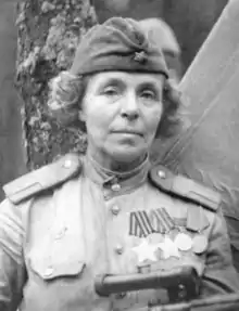 Nina Pavlovna Petrova (Russian: Нина Павловна Петрова; 27 July 1893 – 1 May 1945) was a Soviet sniper during the Winter War and World War II. She was credited with 122 kills by soviet government. She was posthumously awarded the Order of Glory 1st class on 29 June 1945, making her one of only four women to be awarded all three classes of the award.