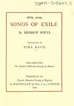Nina's first published translation, of Abraham ibn Ezra's The Song of Chess, appeared in the Jewish Chronicle on 22 June 1894.[4] Later that year, she contributed an essay and a poem on "The Ideal Minister of the Talmud" to the Jewish Quarterly Review, then under the editorship of Claude Montefiore and Israel Abrahams, and continued thereafter publishing translations of medieval Hebrew poetry in the Jewish press.[12] Israel Zangwill, an acquaintance of her father, provided her with an introduction to Mayer Sulzberger of the Jewish Publication Society of America, which published her Songs of Exile by Hebrew Poets in 1901.[9] The collection, which attracted widespread attention, included translations of poems by Judah Halevi, Abraham ibn Ezra, Eleazar ben Killir, Solomon ibn Gabirol, Joseph ben Samuel Bonfils, and Meir of Rothenburg, as well as passages from the Talmud and Midrash Rabba.[13]