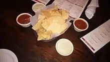 Original Ninfa's chips, tomato salsa, and green sauce