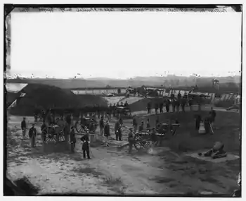 The 9th New York Heavy Artillery joined the VI Corps on the banks of North Anna River on May 26, 1864, and then marched to the Pamunkey during the nights of May 27 and 28. From there, it departed for Cold Harbor on May 29, guarding the wagon train along the way, where it saw its first offensive action on June 1, 1864, at the Battle of Cold Harbor, where the brigade they were part of charged at 6 pm and captured several hundred prisoners, and also managed to hold against several counterattacks on June 2.[15] It also participated in the major attack on June 3, being placed second and third in the line of battle in Keifer's Brigade (110th Ohio and 122nd Ohio Infantry in the first line of battle, and 6th Maryland, 126th Ohio, and 138th Pennsylvania Infantry in the fourth line) in the 3rd Division, where they were ordered at 6 am to proceeded to advance 200 yards, where upon they entrenched under heavy fire.[16] Over the course of the Battle of Cold Harbor the 9th numbered 43 killed and mortally wounded, 99 wounded, and 6 missing, for a total of 148.