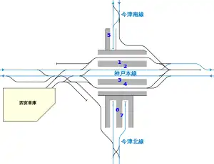 - Imazu Line: on the north side of the Kobe Line, a side platform and a dead-end platform serving 4 tracks, one of which tracks was removed in 1977.