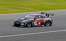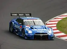 Nismo, the motorsport division of Nissan, participated with the GT-R Nismo GT500 in the Super GT series for the first time in 2008, replacing the 350Z GT.[5] The GT500 version of the car featured a completely different drivetrain compared to the production car. It featured the VK45DE 4.5-litre naturally aspirated V8 engine, replacing the VR38DETT engine.[6] It used a 6-speed sequential manual gearbox and a rear-wheel-drive layout derived from its predecessor.[7] A prototype was spotted testing around the Suzuka Circuit, as well as at the Fuji Speedway in Japan.[8][9] It went onto win the opening round of its debut season, at Suzuka scoring a 1–2 finish for Nissan.[10] In the following race, repeated its 1–2 result, won the drivers' championship in its debut season, through team Xanavi, and drivers Satoshi Motoyama and Benoît Tréluyer, although they only managed to finish third in the teams' championship. The car's dominant debut season saw it winning 7 out of 9 races and 10 podium finishes with four different teams.[11]