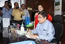 He currently represents the Nagpur constituency in the Lok Sabha and is a lawyer by occupation. He previously also served as a Minister in various departments which includes Water resources and River development, Shipping, Rural Development and MSME. During the cabinet reshuffle on 7 July 2021, the portfolio for the Ministry of MSME which was under him was reassigned to Narayan Rane, another BJP MP from Maharashtra as a part of cabinet expansion. He is often referred to as the "Expressway Man of India" by the media due to his initiation of the Mumbai-Pune Expressway and contributions to the development of expressways and other road infrastructure.[6][7] The World Economic Forum has recognised him as the "pioneer of public–private partnership (PPP) in the road sector in India".[8] Under his tenure as Minister of Road and Transport, Indian highway network grew by 59% within 9 years.[9]