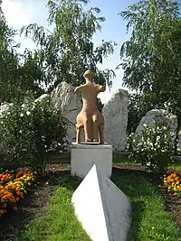 A famous find was a Neolithic (Lengyel culture) figurine of a sitting woman, which was dubbed Hrádocká Venuša, or the Venus of Hradok. "Venus" is an umbrella term used in archaeology for objects of this type. The figurine was depicted on Slovakia's two-koruna coin. In 1997 a statue by Jaroslav Gubric was erected at Hradok, an enlarged copy of the figurine.[2][3]