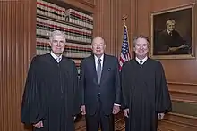 Retired justice Anthony Kennedy flanked by Neil Gorsuch (left) and Brett Kavanaugh (right). Both opinion writers had attended the same school and clerked for Kennedy together.[14]