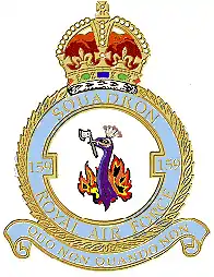 | Squadron Badge heraldry | In Front of logs inflamed, a peacocks head erased, in the beak a woodmans axe.[1][2] |