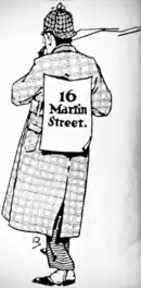 A detective story that immediately suggests a Sherlock Holmes make-up as illustrated. Get a man dressed in a long and loud Ulster coat or Mackintosh, with a long mustache, a fore-and-aft cap, a big pipe, and a placard on his back with the name of the photoplay as shown. On his breast, let him show a placard with your theatre name and date. People will see that first as they meet him. and they will turn to rubber, getting a flash at the title then.[18]