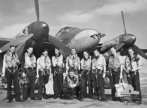 That same night, the squadron's CO and most successful night fighter ace, Wing Commander Keith Hampshire, began a run of success. At 23:50, near Walberton in Sussex he engaged a Ju 88A-4 of 6 Staffel Kampfgeschwader 6. The aircraft, code 3E+AP, crashed near Arundel railway station. The pilot, Hauptmann Anton Oeben, parachuted clear and was made prisoner of war. Observer Feldwebel Otton Bahn was captured badly injured after his parachute failed to open but died of wounds. The same fate befell Unteroffizier Gerhard Drews and Herbert Ehrhardt was listed as missing in action.[16] Hampshire followed this up on the 27/28 March. Over Beer, Devon, he engaged another Ju 88A-4, code 3E+FT, Werknummer 44551, shooting it down at 23:35. Unteroffizier Günther Blaffert was captured, Obergefreiter Gerhart Harteng was killed, Obergefreiter Josef Helm and Gefreiter Adam Kurz was posted missing. Once again the men were from KG 6, this time from 9 staffel.[17] Within minutes the commander gained a second contact and Ju 88A-4, B3+BL, Werknummer 0144551 from 3./Kampfgeschwader 54, crashed near Taunton, Somerset at 23:51. Oberfeldwebel Hans Brautigam, Obergefreiter Kurt Chalon, Alfred Maletzki were captured and Unteroffizier Robert Belz was killed.[18]