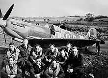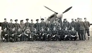 No. 485 (NZ) Squadron was the first of the New Zealand Article XV squadrons, formed on 1 March 1941 at RAF Driffield, in Yorkshire. Its first commander was Squadron Leader Marcus Knight, a pilot from Dannevirke who had joined the RAF in 1935. Following the outbreak of the war, he had spent several months as a flying instructor before taking a fighter pilots course at No. 57 Operational Training Unit in December 1940. He then flew Hawker Hurricanes with No. 257 Squadron and No. 310 Squadron prior to being appointed commander of No. 485 Squadron. The two flight commanders, Frank Brindsen, who was a veteran of the Battle of Britain, and John Martin, were experienced pilots, and among the other personnel were Pilot Officers Edwards Wells and Bill Crawford-Compton.[4][5] While the majority of the pilots that flew with the squadron during the war were New Zealanders, at times its flying personnel included Britons, Canadians and Australians, and even briefly, an American of the United States Army Air Force. There were some ground crew from New Zealand as well, although the majority were British.[6][7]