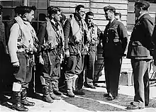 On 22 August the squadron suffered its worst day; during a high cover escort mission for B-26 Marauders, over 50 German fighters attacked the Biggin Hill Wing. Four of the squadron's pilots were shot down with two enemy aircraft shot down in return. One of the pilots lost was Jack Rae, who had destroyed at least eleven enemy aircraft by that stage of the war; he became a prisoner of war.[58] Checketts was shot down the next month but despite receiving burns to his hands and face, he was able to link up with the French Resistance.[59] With their help he, and another pilot of the squadron who had also been shot down and avoided capture, was able to return to England via a fishing boat in October.[60][61]