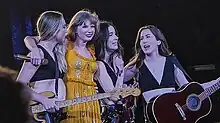 After the album's release, Swift embarked on the Eras Tour in March 2023, as a tribute to her discography and featured different opening acts at selected concerts, and Haim was one of them.[38][39] At shows opened by the band, "No Body, No Crime" replaced "'Tis the Damn Season" on the set list as the opening track of the Evermore act.[40][41] Compared to the studio version, it contains an alternative-country edge to it.[42] Each Haim member would perform with an acoustic guitar, a bass guitar, and an electric guitar and sing with Swift.[41][42] Daniel Kreps from Rolling Stone said its placement "deviated from her usual, ironclad setlist".[43]