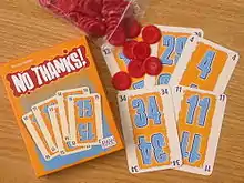 No Thanks! is a card game for three to seven players designed by Thorsten Gimmler. Originally called Geschenkt! (presented (as a gift) in German) and published by Amigo Spiele in 2004, it was translated into English by Z-Man Games.[1][2]