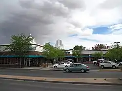 Nob Hill's commercial strip began to develop in the 1930s, spurred both by the growth of the surrounding neighborhoods and by the increasing number of travelers on Central Avenue. The latter became increasingly important after 1937, when Central was designated as U.S. Route 66. The presence of both travelers and local residents in the neighborhood resulted in a mix of businesses catering to the two different markets, including the Aztec Motel (1932), El Oriente Court (1935),[9] Modern Auto Court (1937), Lobo Theater (1938), De Anza Motor Lodge (1939), and Jones Motor Company (also 1939). In 1947, a developer named Robert Waggoman built Albuquerque's first modern shopping center, Nob Hill Business Center, at the southwest corner of Central and Carlisle. Critics of the project labeled it "Waggoman's Folly", believing it was too far from the downtown commercial area to attract much business. Further retail development soon turned Nob Hill into one of the city's premier shopping destinations.[10]