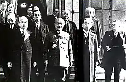 Cropped photo of the wartime Hideki Tōjō cabinet. Kishi is second from the left in the second row, just behind Tōjō's right shoulder.