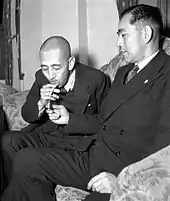 As a self-described "playboy of the Eastern world", Kishi was known during his four years in Manchukuo for his lavish spending amid much drinking, gambling, and womanizing.[28] Kishi spent almost all of his time in Manchukuo's capital, Xinjing (modern Changchun, China) with the exception of monthly trips on the world famous Asia Express railroad line to Dalian, where he indulged in his passion for women in alcohol- and sex-drenched weekends.[29] When he was locked up in Sugamo prison in 1946 awaiting trial, he reminisced about his Manchukuo years: "I came so much, it was hard to clean it all up”.[29] According to Driscoll, "photographs and written descriptions of Kishi during this period never fail to depict a giddy exuberance: laughing and joking while doling out money during the day and looking forward to drinking and fornicating at night."[30] Kishi was able to afford his hedonistic, free-spending lifestyle as he had control over millions of yen with virtually no oversight, thanks to being deeply involved in and profiting from the opium trade.[31] Before returning to Japan in October 1939, Kishi is reported to have advised his colleagues in the Manchukuo government about corruption: "Political funds should be accepted only after they have passed through a 'filter' and been 'cleansed'. If a problem arises, the 'filter' itself will then become the center of the affair, while the politician, who has consumed the 'clean water', will not be implicated. Political funds become the basis of corruption scandals only when they have not been sufficiently 'filtered.'"[4]