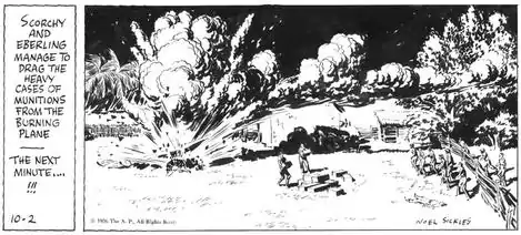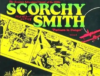 Sickles was assigned to the action/adventure comic Scorchy Smith, whose creator, John Terry, was suffering from tuberculosis. Loosely modeled on Charles Lindbergh, Scorchy was a pilot-for-hire who flew into numerous high-octane globe-trotting adventures. The series, which started in 1930, was heavily influenced by Roy Crane’s adventure strip Wash Tubbs. Sickles initially illustrated the strip as a ghost artist, but he signed his own name after Terry's 1934 death.