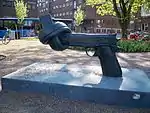 The oversized public version of the piece was planned for John Lennon’s memorial Strawberry Fields in Central Park.[5] This sculpture was made 1984,[6] but when the memorial was opened in 1985 Reuterswärd opted not to have it placed there, citing fears it would be stolen.[7] In 1988, the Luxembourg government bought and donated it to the United Nations. The sculpture was moved right outside of the headquarters of the UN.[8][9] Here it was interpreted not only a memorial for John Lennon, but as a symbol against violence and war anywhere in the world.