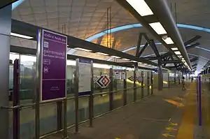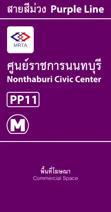 Nonthaburi Civic Center station (Thai: สถานีศูนย์ราชการนนทบุรี, RTGS: Sathani Sun Ratchakan Nonthaburi) is a Bangkok MRT station on the Purple Line and Pink Line. The station is located on the Rattanathibet road in Nonthaburi Province.[1] The station opened on 6 August 2016 on the Purple Line, while the Pink Line opened on 21 November 2023.[2]