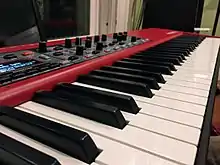The Nord Piano, released in 2010, has 88 keys with hammer action, an effects section with effects such as reverb and amplifier simulations.[3] It also has some unusual features designed to make the piano sounds more realistic, such a simulation of unplayed strings resonating in sympathy with the played strings, and samples of the pedal noises.[2] Up to 120 programs can be used in 24 banks, with a total of 500MB RAM available for samples.[4]