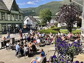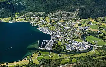 The town is a commercial hub for the municipality and greater Nordfjord region. It includes several industries, such as timber, agriculture, electronics and commerce. It is the shopping hub for surrounding villages and towns, due to the shopping center and commerce streets. There are five primary schools, one lower secondary school and an upper secondary school connected to the Opera House in the town.
