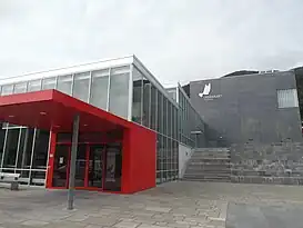 The building also houses a cinema, and a library and is connected to the local upper secondary school. The main stage is 14-metre (46 ft) wide, and 10 m (33 ft) deep, with a capacity of 530 seats. Of these, 218 seats are located in the gallery. When the orchestra pit is in use, capacity is 484. The chamber is specially constructed and adapted for acoustic music, using the same techniques as found in the Oslo Opera House.[25]