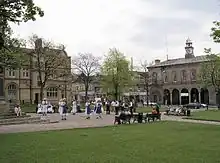 It takes its name from the Dukes of Norfolk, a major landowning family in the area who constructed many of the buildings in the square, which was once known as Norfolk Gardens.[1] Glossop Market and Glossop Town Hall are on the southern side, dating from 1838.[2] Many of the square's buildings are listed as Grade II amongst the numerous listed buildings in the town. The Norfolk Arms public house, dating from 1823, stands by the crossroads.[3] The northern side of the square features the 1914 Partington Theatre.[4] The middle of the square is a pedestrianised garden featuring an 1881 drinking fountain and a war memorial commemorating the dead of the First World War.[5][6] In the early twentieth century it was connected to the Glossop Tramway before its closure in 1927.