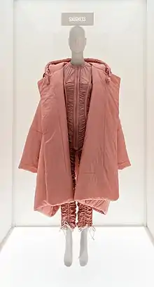 In 1969, Kamali opened a boutique with her then-husband Mohammed Houssein Kamali. She became known for her line of clothing made of real silk parachute material, which included the innovation of being adjustable in length and fit by draw string.[6] Kamali designed the red one-piece bathing suit worn by Farrah Fawcett in the iconic 1976 poster[7] and the bathing suit worn by Whitney Houston on the back cover of her 1985 debut album. Farrah Fawcett's suit was donated to the Smithsonian National Museum of American History in 2011.[8] She is one of several designers credited with popularizing the shoulder pad in womenswear in the 1980s[9][10] and played a prominent role in adapting exaggerated shoulder pads to casual clothes at the beginning of the eighties shoulder-pad era in 1978.[11] She reached a peak of fame during the early 1980s[12] with her 1980 "Sweats" collection, a variety of casual garments done in sweatshirt fabric, most famously flounced, hip-yoked miniskirts called rah-rah skirts in the UK,[13] a style she had first presented in other fabrics in 1979.[14] Her work is included in the collections of the Metropolitan Museum of Art.[15]