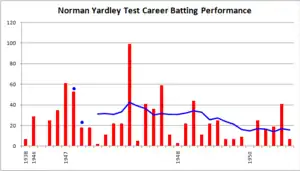 Yardley's Test career batting graph. The red bars indicate the runs that he scored in an innings, and the blue line indicates the batting average in his last 10 innings. The blue dots indicate innings in which he finished not out.