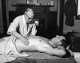 Yardley receiving massage in 1947 before a match against South Africa