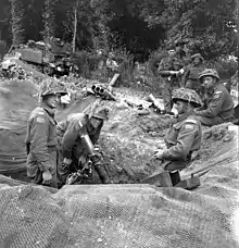 Elements of the SS 12th SS Panzer Division's 12th Reconnaissance Battalion, which was commanded by SS Sturmbannführer Gerhard Bremer, set up fortifications at the front on the night of June 7.[19] The 26th Panzer Grenadier Regiment arrived on the line at around the same time.[20] One of its officers was SS Lieutenant Colonel Wilhelm Mohnke, who had a highly volatile temper and previously ordered the execution of over 100 POWs during the Battle of France in 1940.[21] The Germans were facing forces from the Royal Winnipeg Rifles, the Regina Rifles, the Queen's Own Rifles, the 3rd Canadian Anti-Tank Regiment, and the Cameron Highlanders.[22]