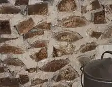 A section interior wall with the plaster removed to show the unusual use of stovewood as insulation