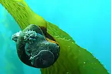 A live individual of Norrisia norrisii, its shell encrusted with barnacles (upper left) and an encrusting coralline alga (lower right part of the shell). The snail is on the giant kelp, species Macrocystis pyrifera
