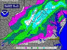 A NOAA snowfall map depicting accumulation in Virginia, after the North American blizzard of 1996. Most of the Shenandoah Valley received two to three feet (61 to 91 cm) of snow.