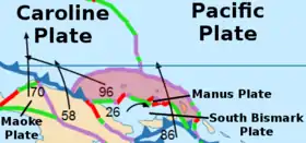 The North Bismarck Plate is a small tectonic plate located in the Bismarck Sea off the northeast coast of New Guinea. It is currently regarded as a relic or inactive plate by most.[3][2] At one time it was called the Manus Plate, but this term was later used for a modelled microplate at the south east boundary of the North Bismarck Plate.[4]: 22