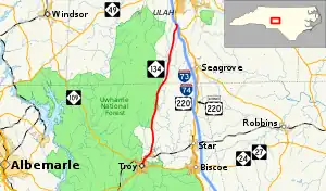 NC 134 is a predominantly two-lane rural highway that begins in downtown Troy at the intersection of North Main Street and East Main Street. Going north, it travels next to Denson Creek Golf Course before becoming the eastern edge of the Uwharrie National Forest. A couple of times the national forest goes over the eastern side of the road but not many. At Beane Country Road, the Uwharrie Forest finally goes west of the road as the road continues north. At Dawson Miller Road, NC 134 ends, just 600 feet (180 m) from the I-73/I-74/US 220 interchange.