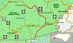 NC 281 is a 36.6-mile (58.9 km) two-lane mountain highway that begins at the South Carolina state line in Jackson County, before quickly entering Transylvania County. In South Carolina, the road continues south as SC 130. It runs concurrent with US 64 near Sapphire, then goes 2.5 miles (4.0 km) east where it splits and continues north to Lake Toxaway. Continuing northwest, the highway becomes aggressively curvy, steep, narrow and in a couple of locations is a gravel road. NC 281 crosses back into Jackson County at Owens Gap (3,590 ft (1,090 m), highest point on route), near Round Mountain to the northeast. The road widens again near the Tuckasegee River and passes by several lakes before ending in Tuckasegee.[2][3]