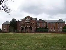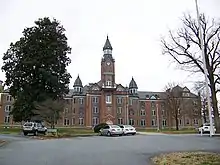 The school is on a national historic district campus in Morganton, North Carolina with 12 buildings on 160 acres (650,000 m2) of land. The school now has an annual budget of over $10 million. The historic district encompasses 14 historic buildings constructed between about 1891 and 1939. They include the main building, classroom buildings, recreational facilities, the original infirmary, staff housing, and farm buildings. They representations of Victorian, Romanesque Revival, Colonial Revival style architecture.[8] The main building is a high Victorian three-story brick building with a slate roof and five-story tower.[9] The Main Building was listed on the National Register of Historic Places in 1976 and the historic district in 1989.[1]