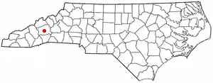 Map of North Carolina, with its counties. Asheville is shown as dot, in Buncombe County. Henderson County is the county to the south of Buncombe County.