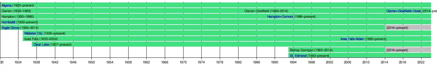 For many years, the North Central Conference was an eight-team league.[1] Schools from Algona, Clarion, Clear Lake, Eagle Grove, Hampton, Humboldt, Iowa Falls, and Webster City competed in the conference. In the 1980s, Hampton and Clarion both began whole grade-sharing with smaller neighboring districts (Dumont and Goldfield, respectively). The districts reorganized into Hampton–Dumont and Clarion–Goldfield, respectively.[2]