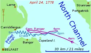The North Channel naval duel was a single-ship action between the United States Continental Navy sloop of war Ranger (Captain John Paul Jones) and the British Royal Navy sloop of war Drake (Captain George Burdon) on the evening of 24 April 1778. Fought in the North Channel, separating Ireland from Scotland, it was the first American naval success within Atlantic waters, and also very nearly the only American naval victory in the Revolutionary War achieved without an overwhelming superiority of force. The action was one of a series of actions by Jones that brought the American War of Independence to British waters.