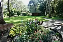 The lawn and pavilion by the dining tables at the entrance to the botanic garden.
